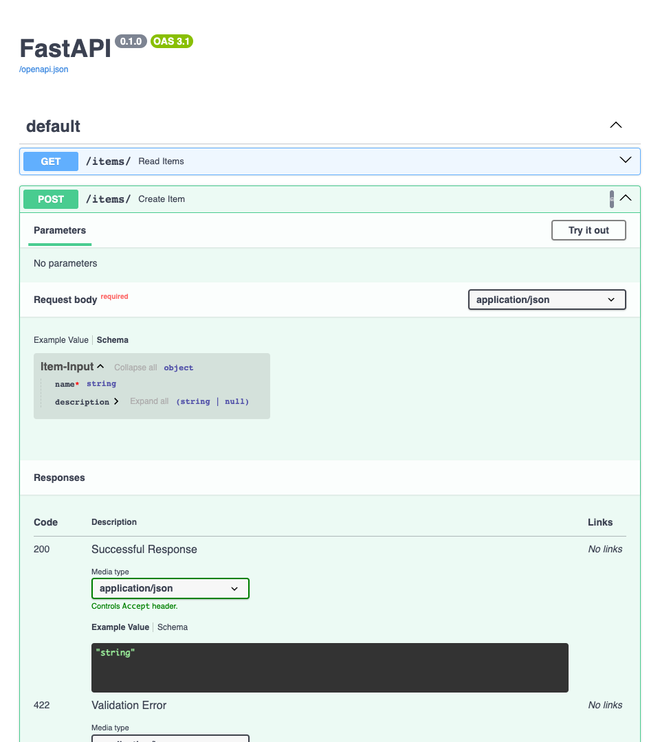 And if you check all the available Schemas (JSON Schemas) in OpenAPI, you will see that there are two, one Item-Input